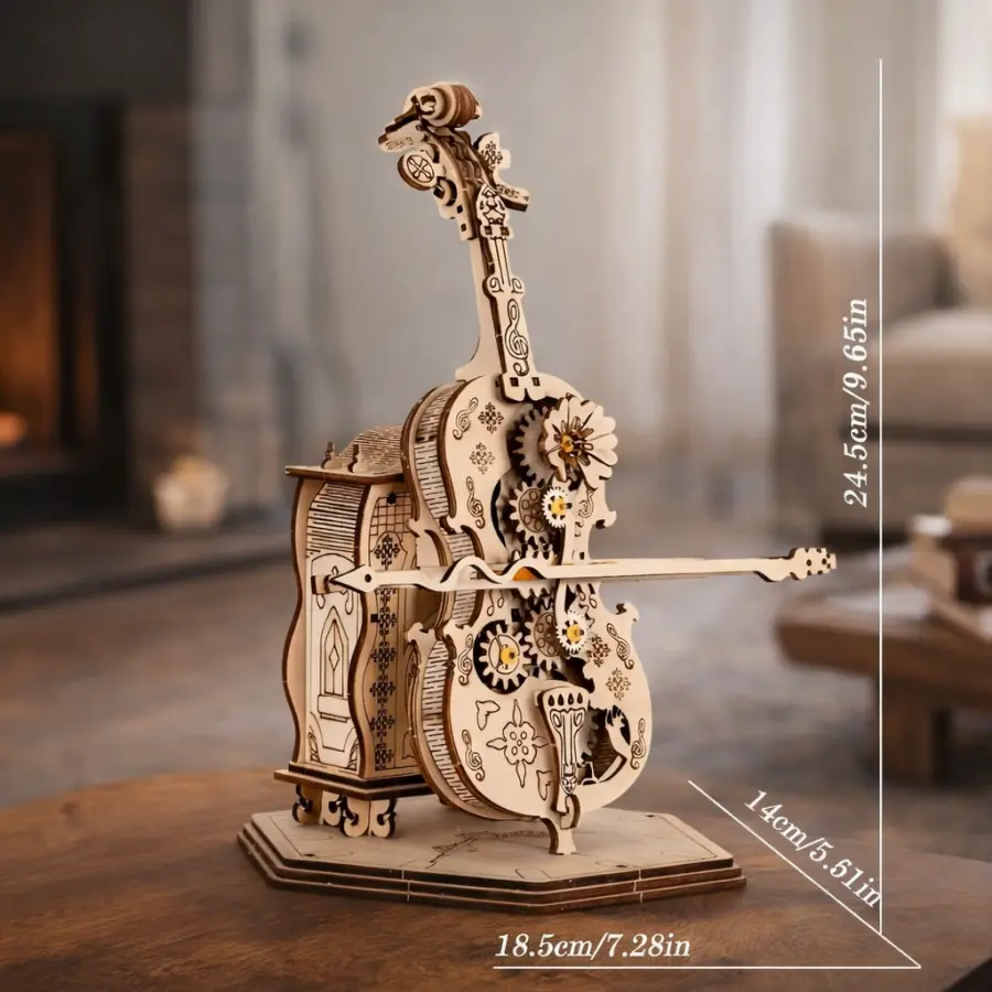 Our wooden cello model captures the instrument’s graceful curves, elegant scroll, and distinctive f-holes while adding a creative steampunk twist with exposed mechanical gears that bring visual intrigue to this classical form.