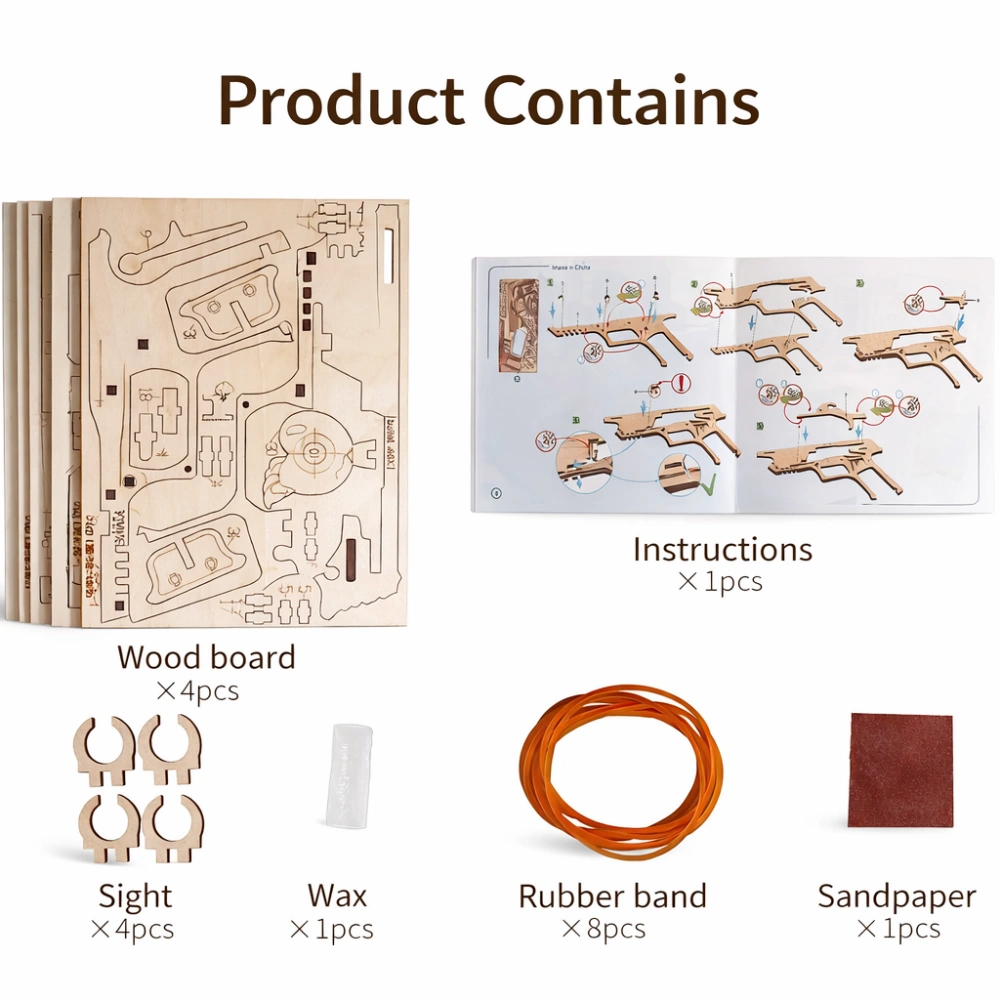| Includes | 4 wood boards, 4 sights, 8 rubber bands, wax, sandpaper, instructions |