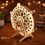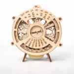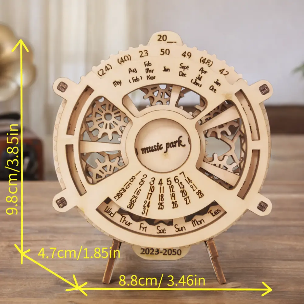 The warm wood tones and intricate gear cutouts give this calendar a steampunk-meets-vintage aesthetic. It stands on its own tripod base at roughly 4 inches tall—visible enough to catch attention, compact enough not to clutter. The “Music Park” branding on the center dial adds a touch of artisan character.