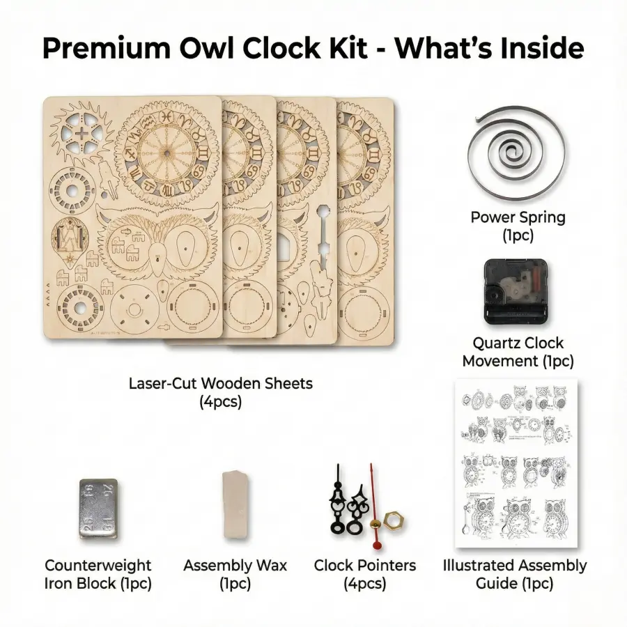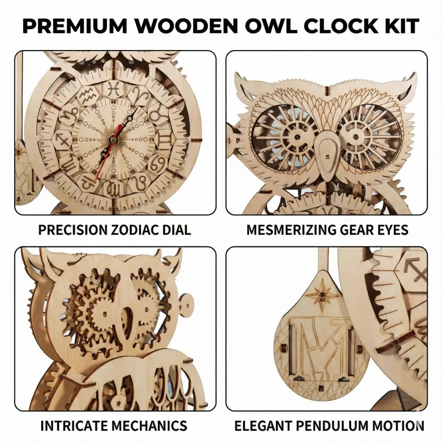 Crafted from premium, eco-friendly wood, this 102-piece puzzle kit offers 1 to 1.5 hours of engaging, meditative assembly. Each component is precisely laser-cut for seamless fitment, making the building process smooth and satisfying. Watch your celestial owl guardian take shape piece by piece, creating a meaningful connection with your finished timepiece.