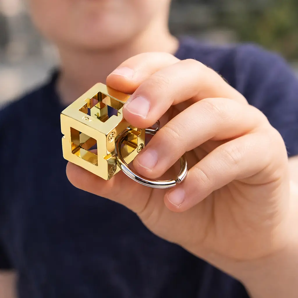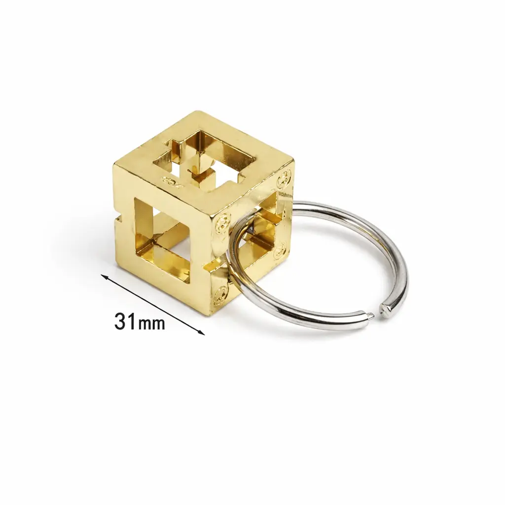 This is a brass cube maze puzzle keychain. The goal is deceptively simple: remove the ring from the cube. The catch? The ring can only move through specific notches cut into the cube’s internal edges. Find the path, follow it without backtracking, and the ring slips free. Miss a turn, and you’re back where you started.