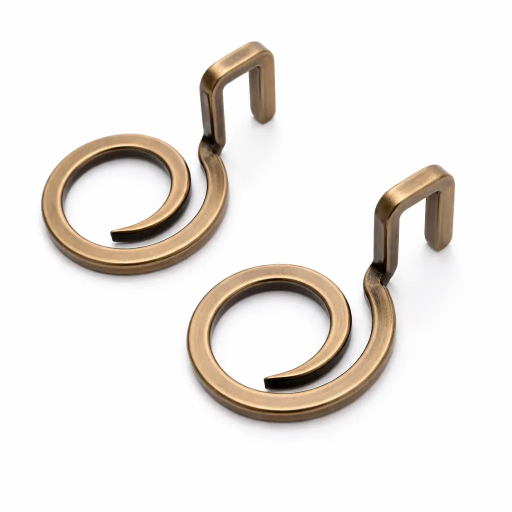 Each piece is a single casting of solid metal alloy finished in an antique bronze tone that catches light in a way that makes it look like something pulled from an old watchmaker’s drawer. At approximately 60mm tall, the pair fits in one hand with room to spare. The hook profile features a smooth S-curve that terminates in flat, rounded tips — no sharp edges, no rough spots. The casting seams are clean and nearly invisible.