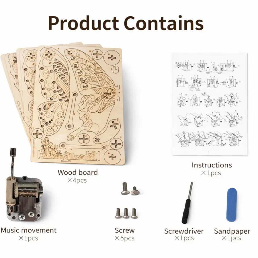 | Included in the Box | Wood boards ×4, instructions ×1, music movement ×1, screws ×5, screwdriver ×1, sandpaper ×1 |