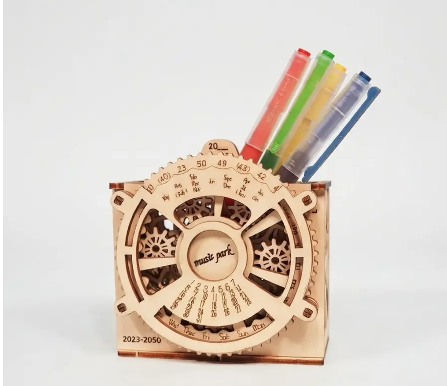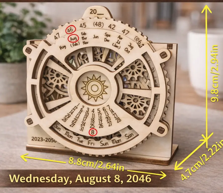 The intricate gear system displays any date from 2023 to 2050 by aligning year numbers with corresponding months to reveal the precise day of the week. This feature isn’t just practical—it engages your spatial reasoning and problem-solving abilities every time you check a date. Browse our wooden puzzle collection for more brain-engaging desktop accessories.
