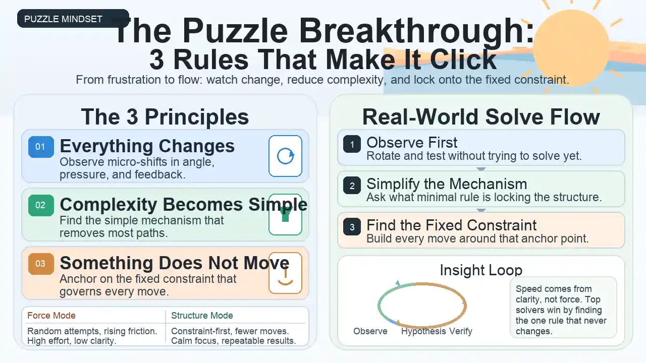 The practical takeaway is direct: when you are stuck on a puzzle, you are almost certainly overcomplicating it. The mechanism has a design logic. That logic is simpler than the shape of the object suggests. Your job is not to try every combination — your job is to find the principle that eliminates most combinations at once.